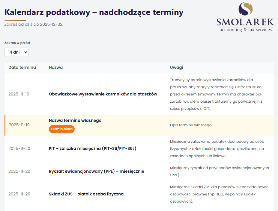Wygląd i działanie kalendarza można sprawdzić tu: https://smolarek.biz.pl/kalendarz-podatkowy/